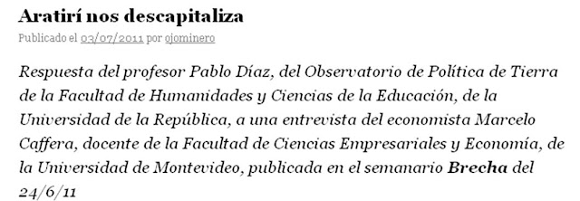 Porque eso supone por un lado aceptar que Zamín Ferrous empiece a explotar y a seguir vendiendo acciones para que vaya a saber que otra empresa “a-nacional” lo haga como socia en Aratirí. Así como también supone seguir destrozando al Estado y hacerlo más cómplice del extractivismo extranjero que nos lleva a ser un “enclave” o “república bananera”, que vivirá de papeles en los bancos no de su propia producción…